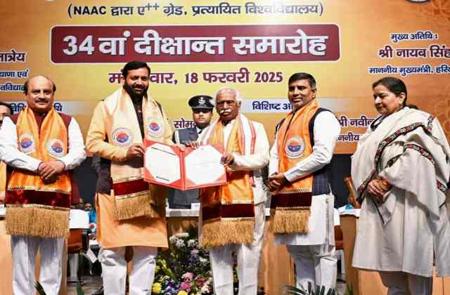 कुरुक्षेत्र, 18 फरवरी (हरफूल सिंह)। हरियाणा के राज्यपाल और कुरुक्षेत्र विश्वविद्यालय के कुलाधिपति बंडारू दत्तात्रेय ने मंगलवार को विश्वविद्यालय के 34वें दीक्षांत समारोह में मुख्यमंत्री नायब सिंह सैनी पहुंचे। इस दौरान उन्हें सामाजिक व राजनीतिक क्षेत्र में उनके विशिष्ट योगदान के लिए डॉक्टर ऑफ लिटरेचर की मानद उपाधि से अलंकृत किया। दीक्षांत समारोह में लगभग 2000 विद्यार्थियों को डिग्री, 130 पंजीकृत पीएचडी धारकों को पीएचडी की उपाधि और 91 पंजीकृत विद्यार्थियों को गोल्ड मेडल व मेरिट सर्टिफिकेट प्रदान किए गए।